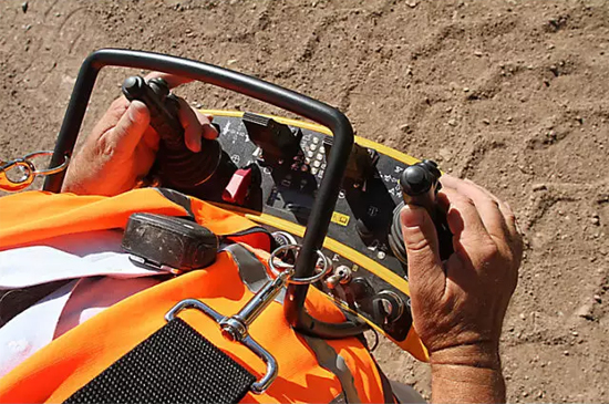 当你坐上这台符合人机工程学设计的操作台时,眼前的屏幕从不同视角全方面展示着千里之外的推土机实际运营状态以及周围环境,无论是手柄还是脚下刹车都与真实操作情况一致。除了一体式操作台,更有便携式操作手柄。通过远程操作系统,操作手可以选择视野更好的角度观察设备运行,与坐在驾驶室内操控相比,能够更充分地评估操作地形,平稳、连续地对设备进行远程控制。不仅如此,远程控制系统可以帮助施工人员远离存在危险的作业现场,使施工变得更加安全、作业环境更为舒适。
